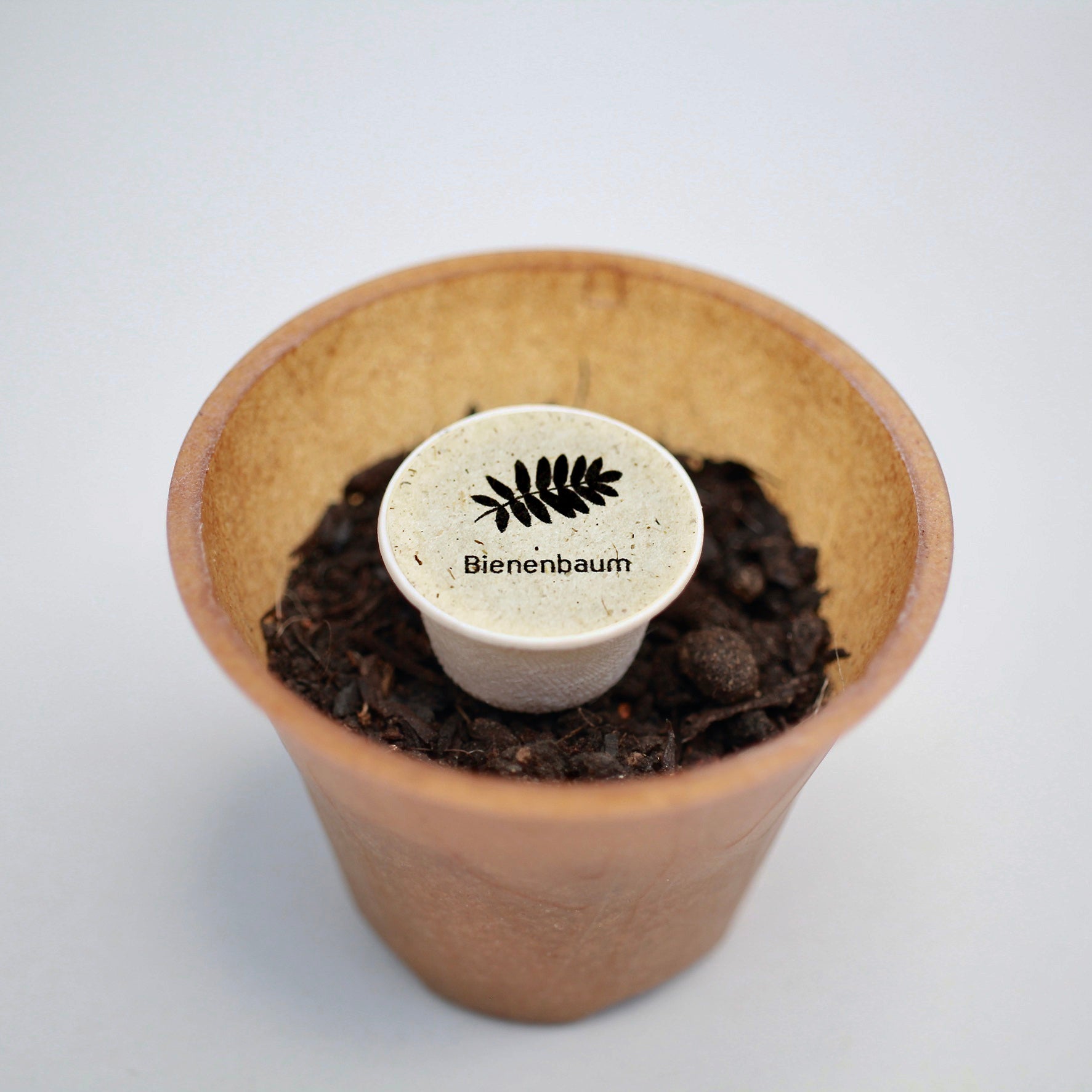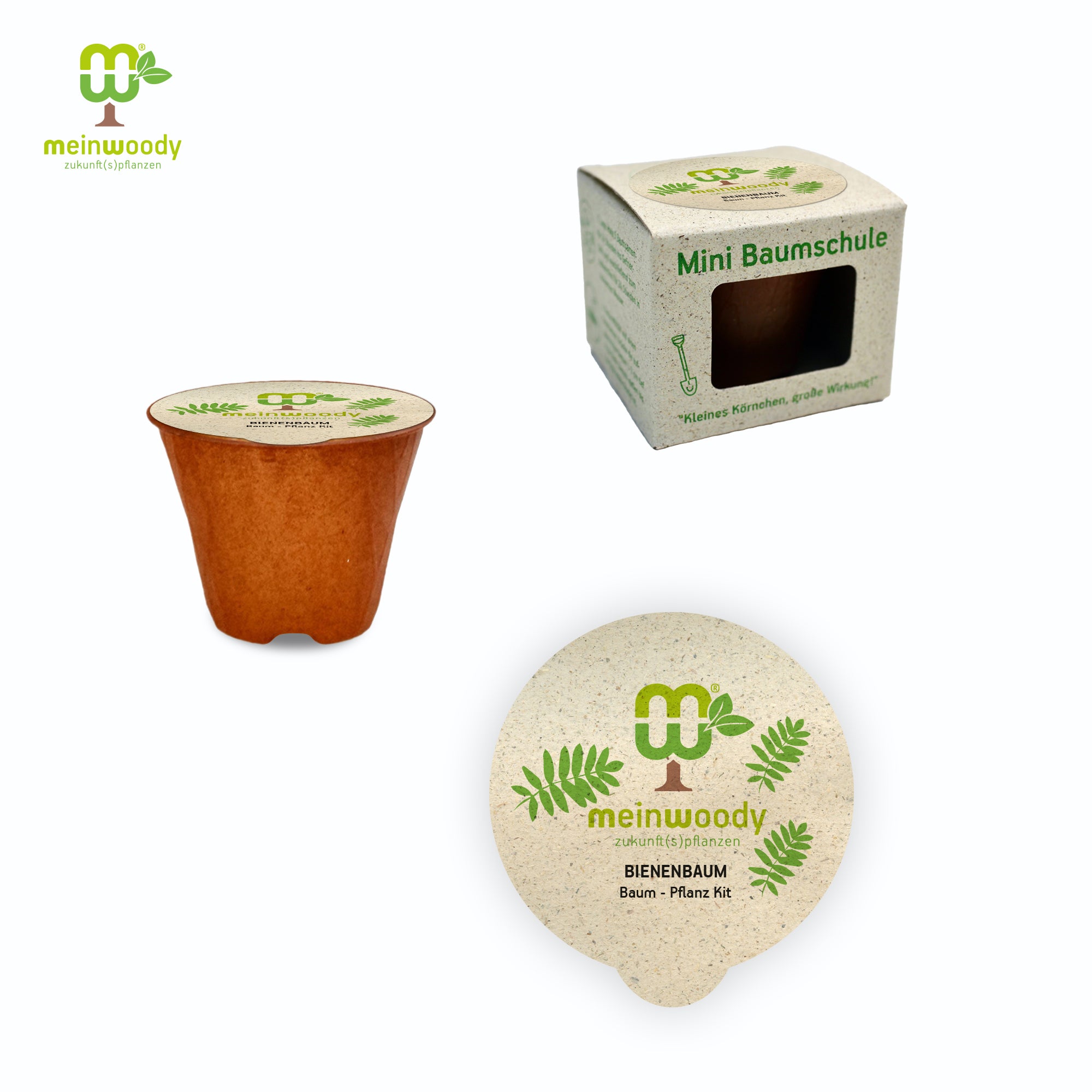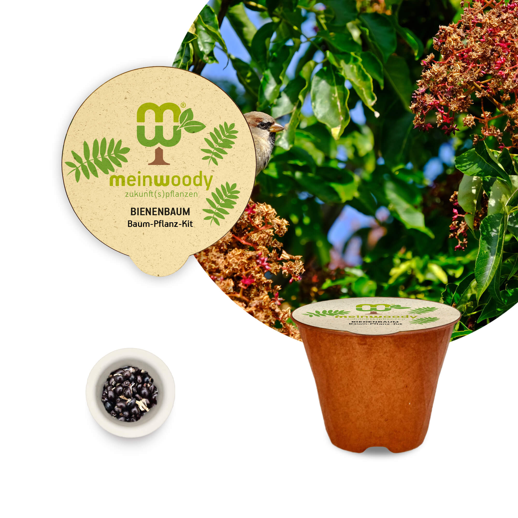 Mit dem Bienenbaum Baum-Pflanz-Kit von Meinwoody kannst du in wenigen Schritten deinen eigenen Baum pflanzen. Öffnen, Samen in die Erde eindrücken, gießen. Fertig!