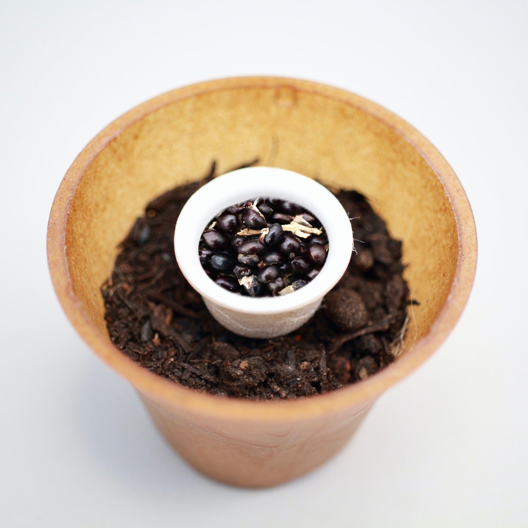 2. Stelle WOODY auf einen Untersetzer. Drücke die aufgeweichten Samen 1-2 cm tief in die Erde. Danach gießen bis die Erde schön feucht ist.