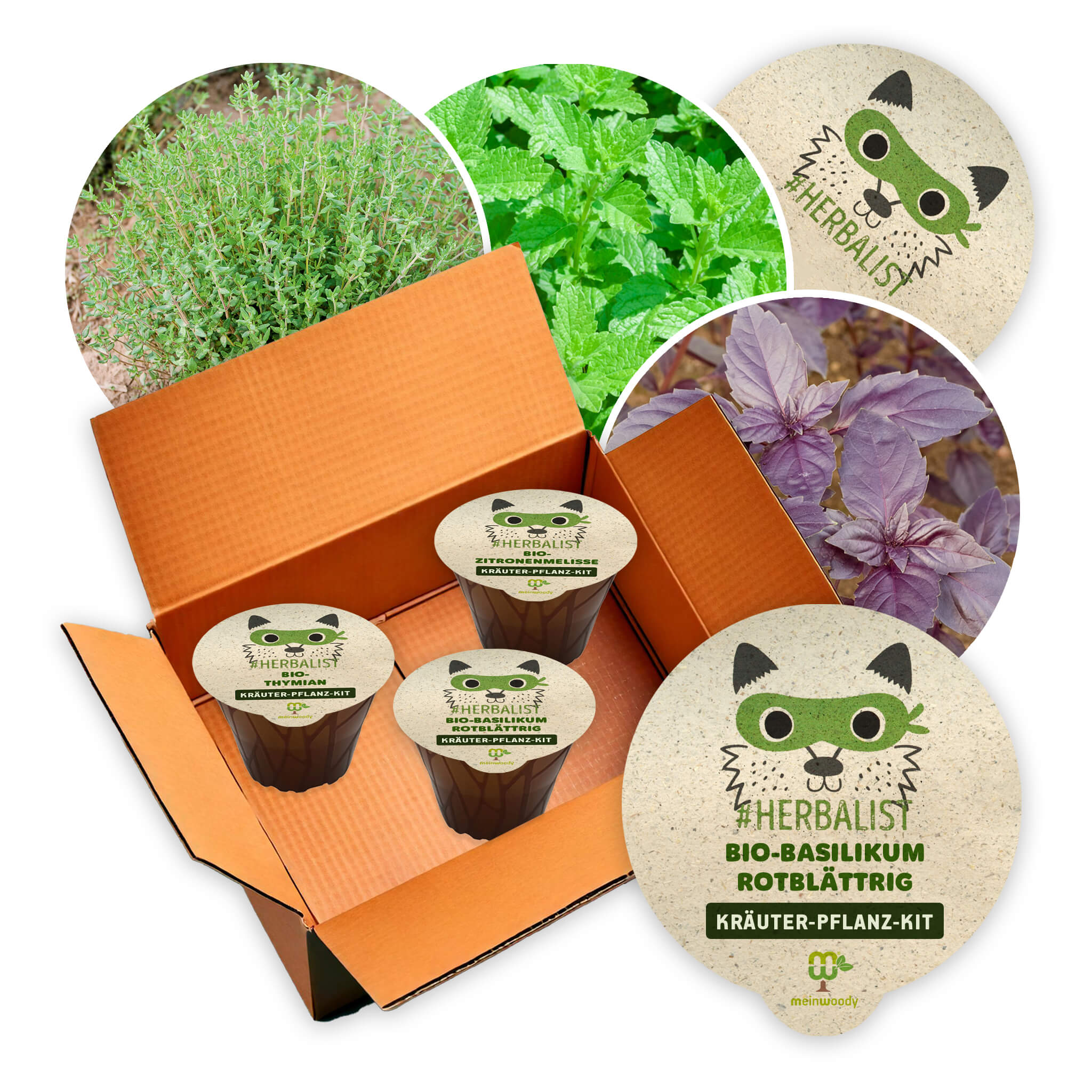 Mit dem #HERBALIST-Pflanz-Kit von meinwoody kannst du einen kleinen Kräutergarten ansäen und großziehen. Das Kit beinhaltet drei Sets mit je einer Sorte Kräuter-Saatgut und alles was du dazu brauchst um Kräuter-Samen selbst anzuziehen. Bio-Basilikum Rotblättrig, Bio-Zitronenmelisse und Bio-Thymian Samen - und das alles in unserem plastikfreien und biologisch abbaubaren Pflanztopf "Plenta".