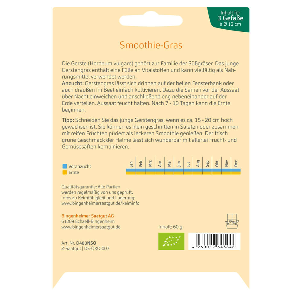 Anzucht: Gerstengras lässt sich drinnen auf der hellen Fensterbank oder auch draußen im Beet einfach kultivieren. Dazu die Samen vor der Aussaat über Nacht einweichen und anschließend eng nebeneinander auf der Erde verteilen. Aussaat feucht halten. Nach 7 - 10 Tagen kann die Ernte beginnen.